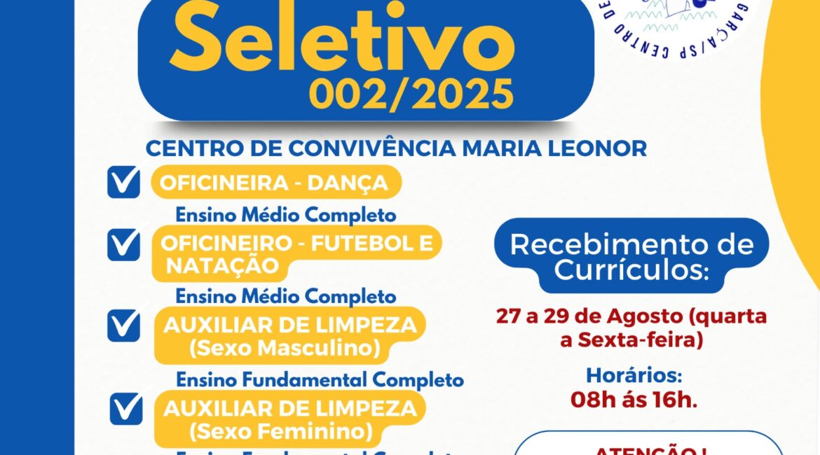 A Diretoria da Associação Brasileira das Franciscanas de Garça – Centro de Convivência Maria Leonor torna público o PROCESSO SELETIVO 002/2025, que tem como objetivo a formação de CADASTRO RESERVA, para os cargos: Auxiliar de Limpeza (Masculino e Feminino), Pajem, Facilitador de Oficina (Dança) e Facilitador de Oficina (Futebol e Natação).